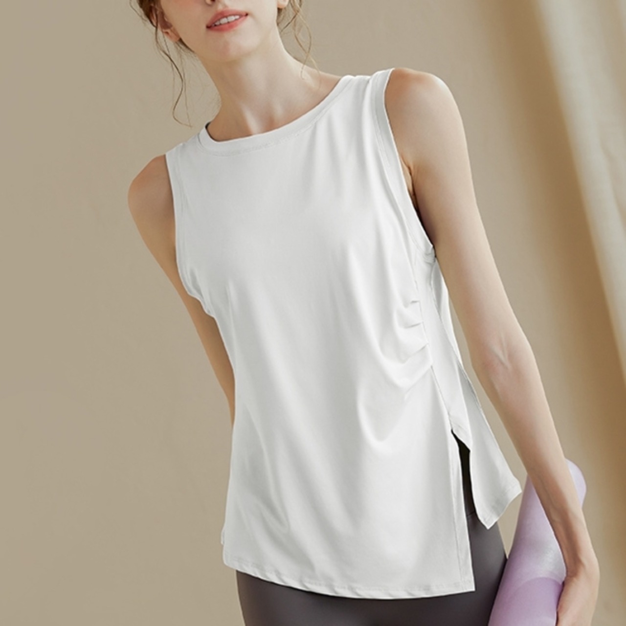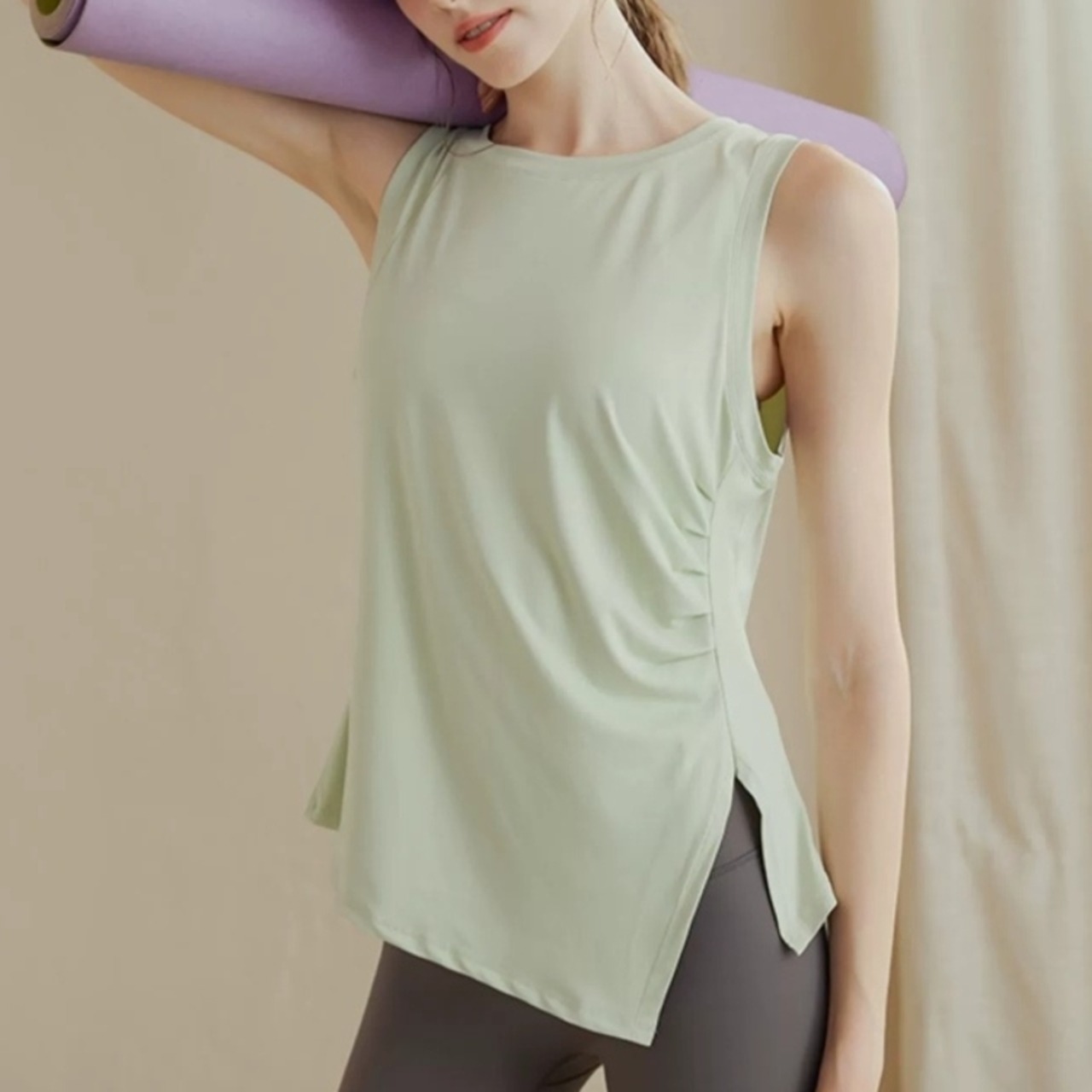 アシメトリーヘム サイドスリット ラウンドネックトップス *5col* 00111 ノースリーブのラウンドネックトップスは、アシンメトリーなヘムラインがポイント。 シンプルながらも洗練されたデザインで、ヨガやピラティスなどのアクティブなシーンで動きやすさを妨げません。 身体に程よくフィットするシルエットは、体型を美しく見せてくれます。 様々なボトムスと合わせやすく、デイリーユースにも最適です。 □サイズ 【S】胸囲:80cm 着丈:54cm 裾まわり:94cm 【M】胸囲:84cm 着丈:55.5cm 裾まわり:98cm 【L】胸囲:88cm 着丈:57cm 裾まわり:102cm 【XL】胸囲:92cm 着丈:58.5cm 裾まわり:106cm ※海外製品のため1-3cm程度誤差のある場合がございます。 □カラー グリーン ブラック ホワイト ピンク パープル □素材 90%:ポリエステル 10%:ポリウレタン □お届けについて こちらの商品は海外店舗より直接発送となる為、ご入金から1週間〜3週間前後で発送致します。 □注意事項 ・タイミングによっては 商品在庫切れにより注文キャンセルとさせていただく恐れもございますので、予めご了承くださいませ。 ・こちらは輸入品となります。日本製とは検品基準が異なる為、新品未使用品でもごくわずかな汚れや傷がある場合もございます。 ・商品の色味は、お手持ちのスマートフォンの画面によって実物と若干異なる場合がございます。 ・イメージ違いやサイズ等、お客様都合による交換、返品、キャンセルは対応出来かねます。 ———————————— ご購入前にこちらをお読みください →https://shop.99yoga-a.com/about ————————————