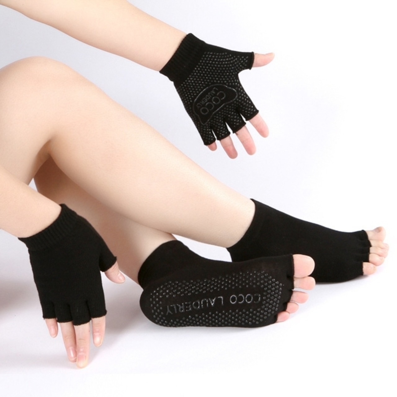 指先と手のひらにグリップ力のあるパッド付きグローブと、つま先にグリップ力のある滑り止め付きソックスの2点セットです。