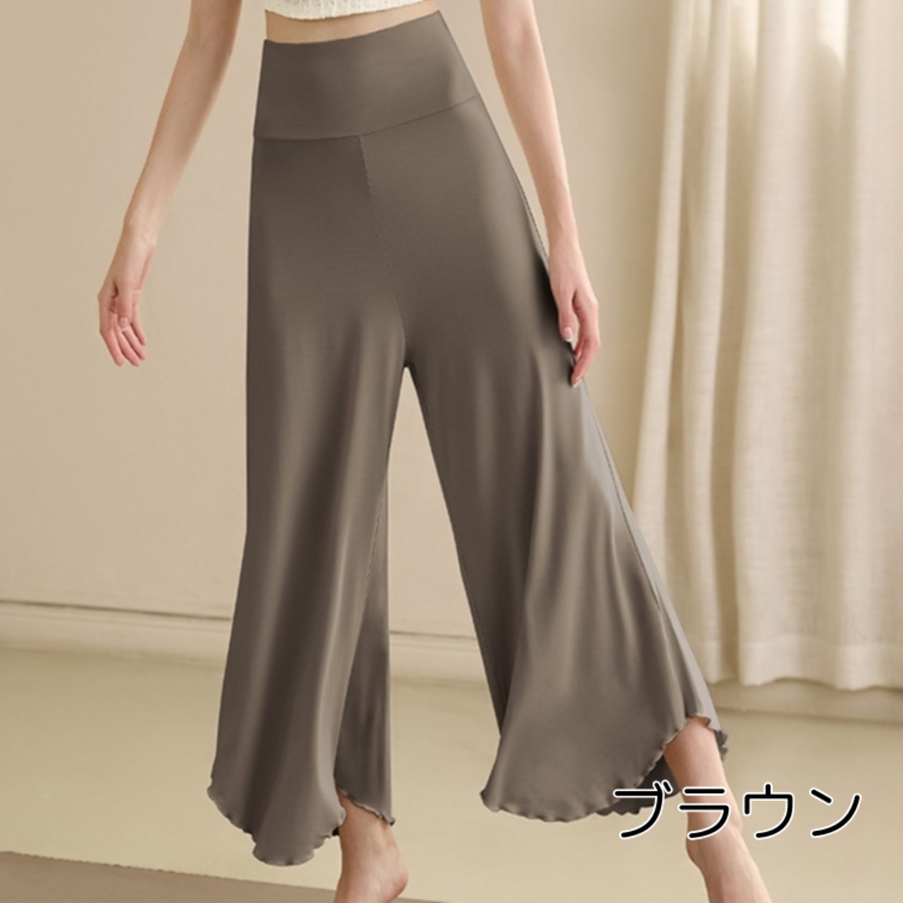 -------------------------------------------------------------------------- いますぐ!LINEお友だち追加で【クーポンGet】 ▶https://shop.99yoga-a.com/blog/2025/02/01/152128 注目!BEST SELLERはこちら ▶https://shop.99yoga-a.com/categories/6928766 -------------------------------------------------------------------------- ハイウエストでスタイルアップ効果も期待できるワイドレッグフレアパンツ。 裾のフリルが、歩くたびに軽やかな動きを演出します。 ゆったりとしたシルエットは、リラックスした着心地を実現。 ヨガやピラティスなどのアクティブなシーンはもちろん、おうち時間にもおすすめです。 □サイズ(cm) 【M】ウエスト:55 ヒップ:92 パンツ丈:96 【L】ウエスト:59 ヒップ:100 パンツ丈:97 ※海外製品のため1-3cm程度誤差のある場合がございます。 □カラー アイボリー パープル グリーン オレンジ ブラウン ブラック □素材 92%:コットン 8%:ポリウレタン □お届けについて こちらの商品は海外店舗より直接発送となる為、ご入金から1週間〜3週間前後で発送致します。 □注意事項 ・タイミングによっては 商品在庫切れにより注文キャンセルとさせていただく恐れもございますので、予めご了承くださいませ。 ・こちらは輸入品となります。日本製とは検品基準が異なる為、新品未使用品でもごくわずかな汚れや傷がある場合もございます。 ・商品の色味は、お手持ちのスマートフォンの画面によって実物と若干異なる場合がございます。 ・イメージ違いやサイズ等、お客様都合による交換、返品、キャンセルは対応出来かねます。 -------------------------------------------------------------------------- ご購入前にこちらをお読みください →https://shop.99yoga-a.com/about --------------------------------------------------------------------------