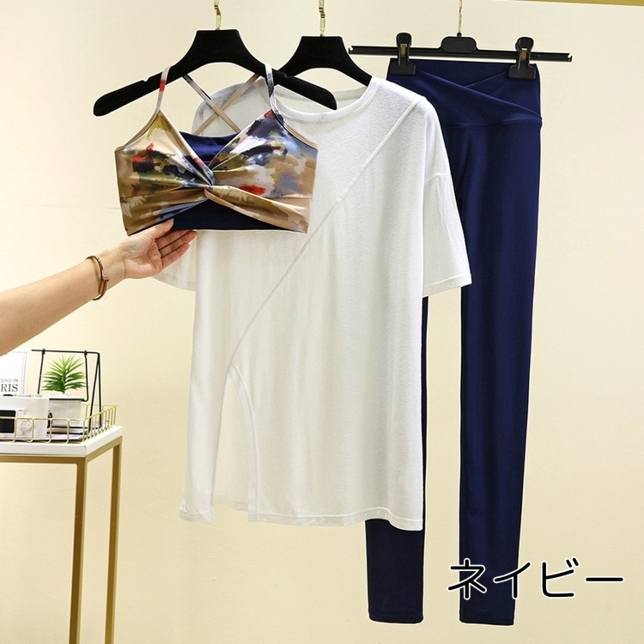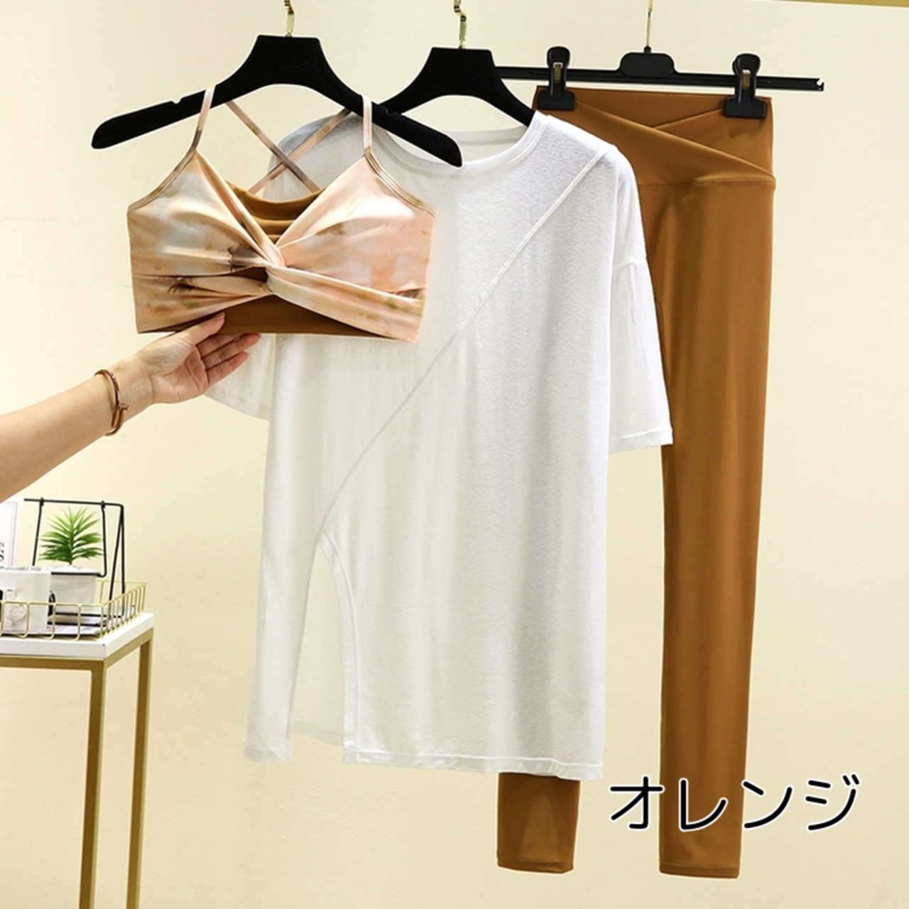 洗練されたデザインと快適な着心地を両立した3点セット。 クロスデザインのブラトップは、アクティブな動きにも対応し、身体を優しくサポートします。 ハイウエストレギンスは、お腹周りをすっきりと見せてくれるだけでなく、どんな動きにもストレスを感じさせません。 シンプルなデザインのTシャツは、様々なシーンで活躍し、レギンスとのコーディネートも楽しめます。 ワークアウトからカジュアルな外出まで、幅広いシーンで活躍する、まさに万能なセットです。 □サイズ(cm) トップス 【S】胸囲:96 着丈:68 【M】胸囲:100 着丈:72 【L】胸囲:104 着丈:76 【XL】胸囲:108 着丈:80 ブラ 【S】胸囲:76 着丈:28 アンダー:56 【M】胸囲:80 着丈:29 アンダー:60 【L】胸囲:84 着丈:30 アンダー:64 【XL】胸囲:88 着丈:31 アンダー:68 レギンス 【S】ウエスト:50 ヒップ:66 パンツ丈:87 【M】ウエスト:54 ヒップ:70 パンツ丈:88 【L】ウエスト:58 ヒップ:74 パンツ丈:89 【XL】ウエスト:62 ヒップ:78 パンツ丈:90 ※海外製品のため1-3cm程度誤差のある場合がございます。 □カラー オレンジ ティーグリーン ネイビー モスグリーン □素材 トップス 70%:再生繊維 30%:収縮糸 ブラ 表地 75%:ナイロン、25%:ポリウレタン 裏地 77%:ポリエステル、23%:ポリウレタン レギンス 77%:ナイロン 23%:ポリウレタン □お届けについて こちらの商品は海外店舗より直接発送となる為、ご入金から1週間〜3週間前後で発送致します。 □注意事項 ・タイミングによっては、商品在庫切れによりご注文をキャンセルさせていただく場合がございます。 ・こちらは輸入品のため、日本製品とは検品基準が異なります。新品未使用品でも、わずかな汚れや小さな傷が見られる場合がございます。 ・商品の色味は、ご覧になる端末や画面設定により、実物と多少異なって見える場合がございます。 ・イメージ違い、サイズ違いなどお客様都合による返品・交換・キャンセルはお受けできませんので、あらかじめご了承ください。 ▶ご購入前にこちらをお読みください https://shop.99yoga-a.com/about -------------------------------------------------------------------------- ▶いますぐ!LINEお友だち追加で【クーポンGet】 https://shop.99yoga-a.com/blog/2025/02/01/152128 ▶注目!BEST SELLERはこちら https://shop.99yoga-a.com/categories/6928766 --------------------------------------------------------------------------