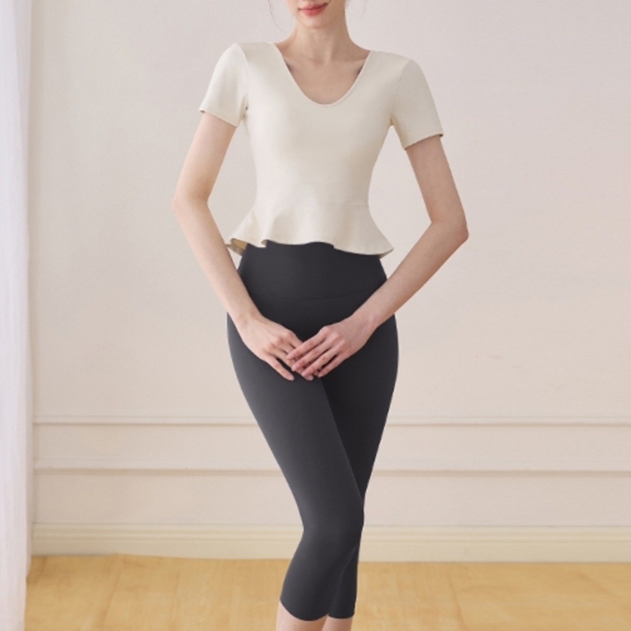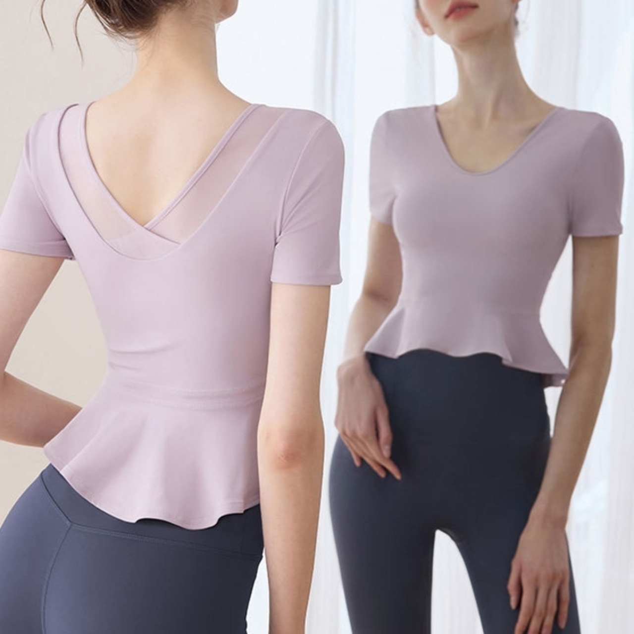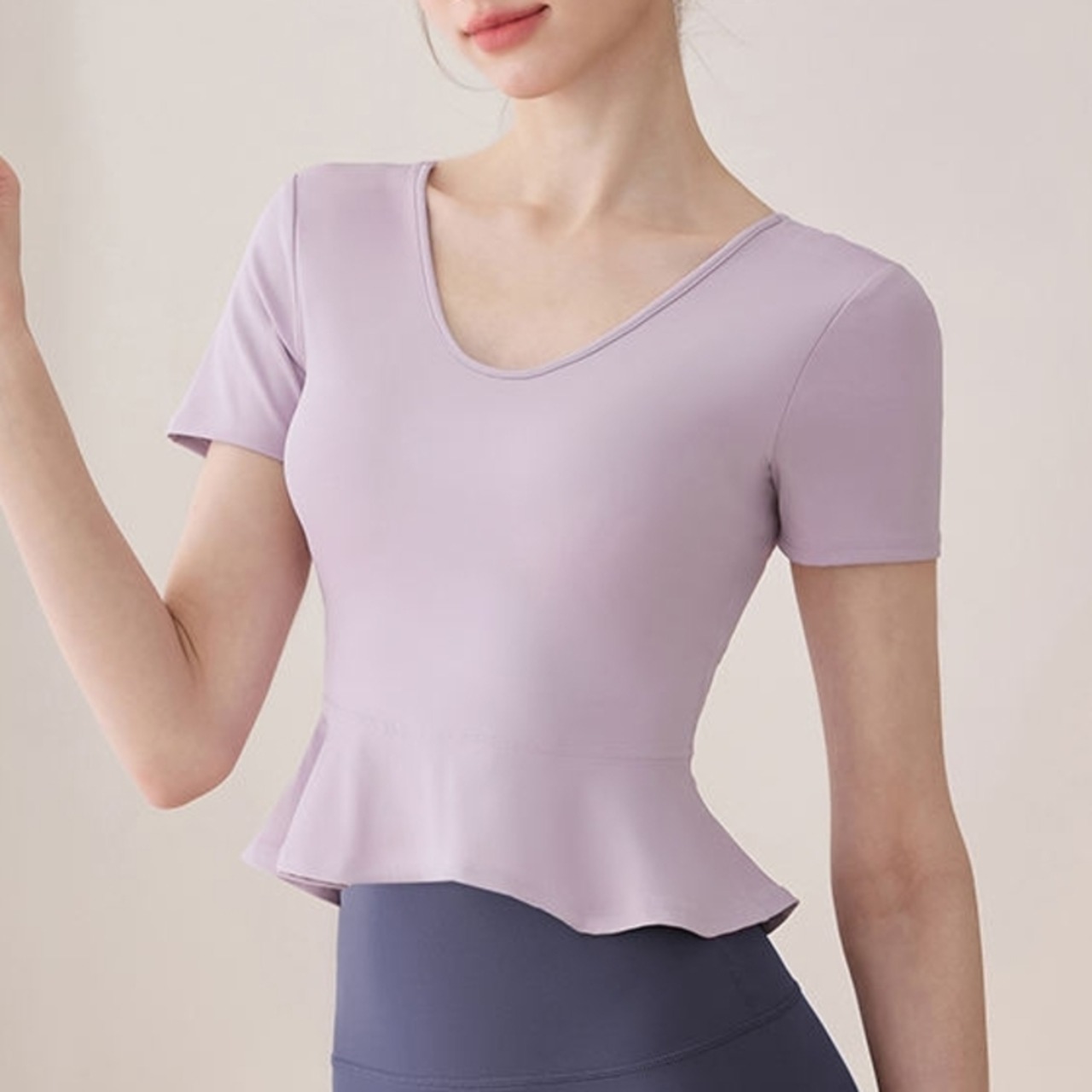 ペプラムヘム ショートスリーブ Vネックトップス *2col* Y0263 ペプラムヘムが女性らしいシルエットを演出する、Vネックショートスリーブトップス。 身体のラインを美しく見せるクロップド丈でありながら、裾のペプラムデザインが気になるお腹周りを自然にカバーします。 レッスンやワークアウト、普段使いと、幅広いシーンで活躍する一枚です。 □サイズ 【S】ウエスト:72cm 着丈:42.5cm 【M】ウエスト:76cm 着丈:43.5cm 【L】ウエスト:80cm 着丈:44.5cm 【XL】ウエスト:84cm 着丈:45.5cm ※海外製品のため1-3cm程度誤差のある場合がございます。 □カラー パープル ホワイト □素材 ナイロン ポリウレタン □お届けについて こちらの商品は海外店舗より直接発送となる為、ご入金から1週間〜3週間前後で発送致します。 □注意事項 ・タイミングによっては 商品在庫切れにより注文キャンセルとさせていただく恐れもございますので、予めご了承くださいませ。 ・こちらは輸入品となります。日本製とは検品基準が異なる為、新品未使用品でもごくわずかな汚れや傷がある場合もございます。 ・商品の色味は、お手持ちのスマートフォンの画面によって実物と若干異なる場合がございます。 ・イメージ違いやサイズ等、お客様都合による交換、返品、キャンセルは対応出来かねます。 ———————————— ご購入前にこちらをお読みください →https://shop.99yoga-a.com/about ————————————