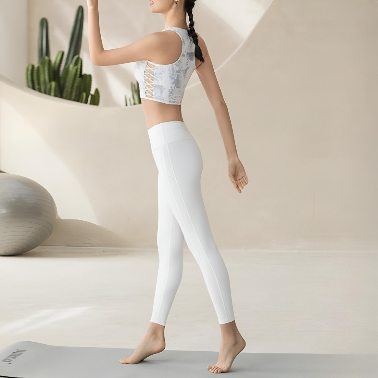ハイウエスト仕様のレギンスは、ショートトップスとの相性も抜群で、お腹周りを気にせずトレーニングに集中できます。